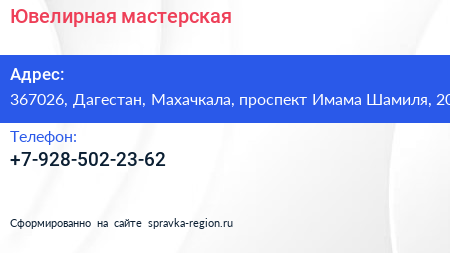 Ювелирная мастерская по адресу 367026, Дагестан, Махачкала, проспект Имама Шамиля, 20 в дальнейшем Организация, размещена в следующих категориях:
