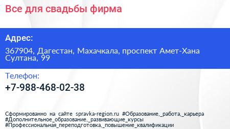 Все для свадьбы, фирма по адресу 367904, Дагестан, Махачкала, проспект Амет-Хана Султана, 99 в дальнейшем Организация, размещена в следующих категориях: