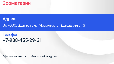 Зоомагазин по адресу 367000, Дагестан, Махачкала, Дахадаева, 3 в дальнейшем Организация, размещена в следующих категориях: