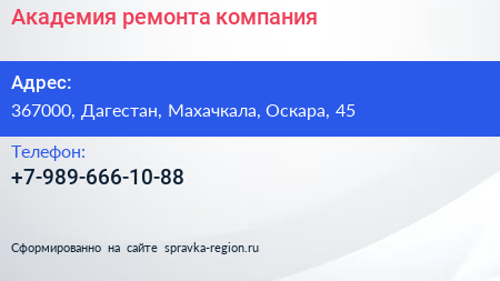 Академия ремонта, компания по адресу 367000, Дагестан, Махачкала, Оскара, 45 в дальнейшем Организация, размещена в следующих категориях: