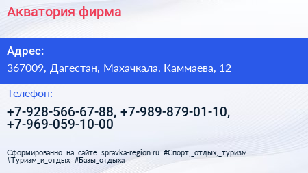 Акватория, фирма по адресу 367009, Дагестан, Махачкала, Каммаева, 12 в дальнейшем Организация, размещена в следующих категориях: