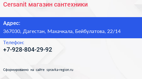 Cersanit, магазин сантехники по адресу 367030, Дагестан, Махачкала, Бейбулатова, 22/14 в дальнейшем Организация, размещена в следующих категориях: