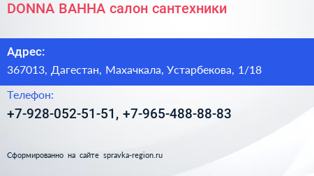 DONNA ВАННА, салон сантехники по адресу 367013, Дагестан, Махачкала, Устарбекова, 1/18 в дальнейшем Организация, размещена в следующих категориях: