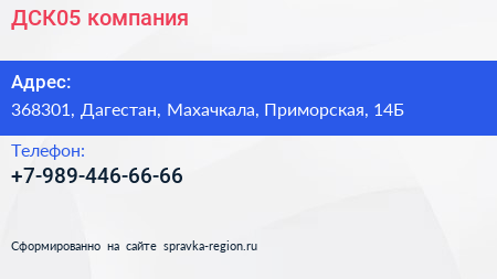 ДСК05, компания по адресу 368301, Дагестан, Махачкала, Приморская, 14Б в дальнейшем Организация, размещена в следующих категориях: