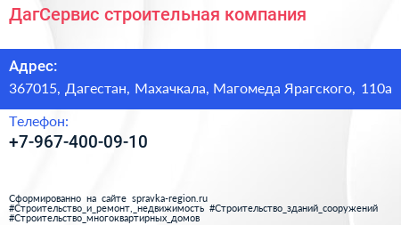 ДагСервис, строительная компания по адресу 367015, Дагестан, Махачкала, Магомеда Ярагского, 110а в дальнейшем Организация, размещена в следующих категориях: