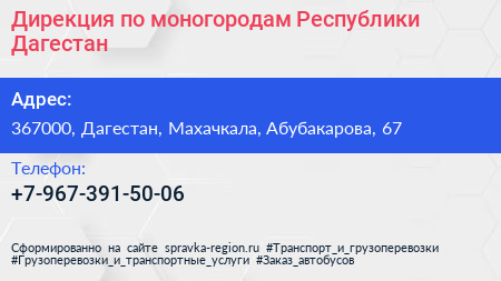 Дирекция по моногородам Республики Дагестан по адресу 367000, Дагестан, Махачкала, Абубакарова, 67 в дальнейшем Организация, размещена в следующих категориях:
