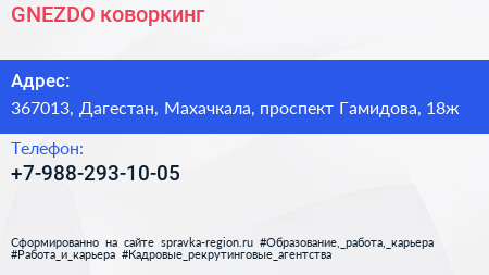 GNEZDO, коворкинг по адресу 367013, Дагестан, Махачкала, проспект Гамидова, 18ж в дальнейшем Организация, размещена в следующих категориях: