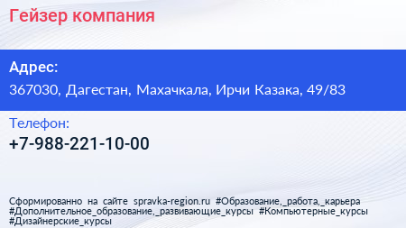 Гейзер, компания по адресу 367030, Дагестан, Махачкала, Ирчи Казака, 49/83 в дальнейшем Организация, размещена в следующих категориях: