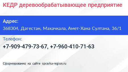 КЕДР, деревообрабатывающее предприятие по адресу 368304, Дагестан, Махачкала, Амет-Хана Султана, 36/1 в дальнейшем Организация, размещена в следующих категориях:
