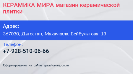 КЕРАМИКА МИРА, магазин керамической плитки по адресу 367030, Дагестан, Махачкала, Бейбулатова, 13 в дальнейшем Организация, размещена в следующих категориях: