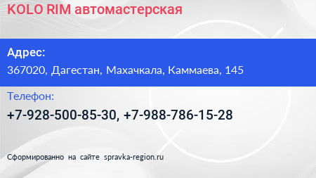 KOLO RIM, автомастерская по адресу 367020, Дагестан, Махачкала, Каммаева, 145 в дальнейшем Организация, размещена в следующих категориях: