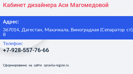 Кабинет дизайнера Аси Магомедовой по адресу 367014, Дагестан, Махачкала, Виноградная (Сепаратор ст), 8 в дальнейшем Организация, размещена в следующих категориях: