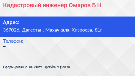 Кадастровый инженер Омаров Б.Н. по адресу 367026, Дагестан, Махачкала, Хизроева, 81г в дальнейшем Организация, размещена в следующих категориях: