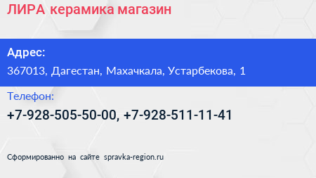 ЛИРА керамика, магазин по адресу 367013, Дагестан, Махачкала, Устарбекова, 1 в дальнейшем Организация, размещена в следующих категориях: