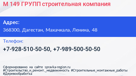 М-149 ГРУПП, строительная компания по адресу 368300, Дагестан, Махачкала, Ленина, 48 в дальнейшем Организация, размещена в следующих категориях:
