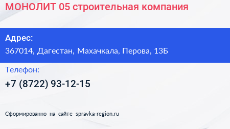 МОНОЛИТ 05, строительная компания по адресу 367014, Дагестан, Махачкала, Перова, 13Б в дальнейшем Организация, размещена в следующих категориях: