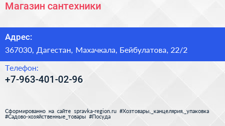 Магазин сантехники по адресу 367030, Дагестан, Махачкала, Бейбулатова, 22/2 в дальнейшем Организация, размещена в следующих категориях: