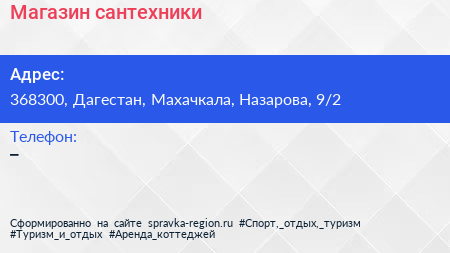 Магазин сантехники по адресу 368300, Дагестан, Махачкала, Назарова, 9/2 в дальнейшем Организация, размещена в следующих категориях: