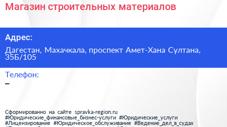 Магазин строительных материалов по адресу Дагестан, Махачкала, проспект Амет-Хана Султана, 35Б/105 в дальнейшем Организация, размещена в следующих категориях: