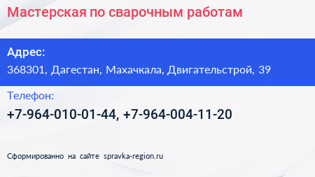 Мастерская по сварочным работам по адресу 368301, Дагестан, Махачкала, Двигательстрой, 39 в дальнейшем Организация, размещена в следующих категориях: