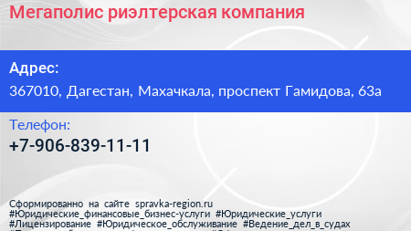 Мегаполис, риэлтерская компания по адресу 367010, Дагестан, Махачкала, проспект Гамидова, 63а в дальнейшем Организация, размещена в следующих категориях: