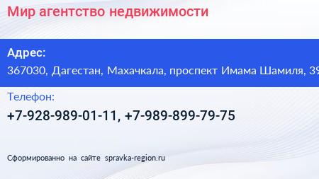 Мир, агентство недвижимости по адресу 367030, Дагестан, Махачкала, проспект Имама Шамиля, 39 в дальнейшем Организация, размещена в следующих категориях: