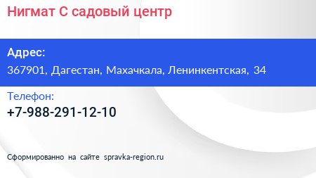 Нигмат-С, садовый центр по адресу 367901, Дагестан, Махачкала, Ленинкентская, 34 в дальнейшем Организация, размещена в следующих категориях: