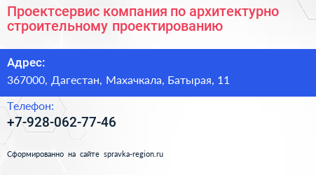 Проектсервис, компания по архитектурно-строительному проектированию по адресу 367000, Дагестан, Махачкала, Батырая, 11 в дальнейшем Организация, размещена в следующих категориях:
