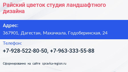 Райский цветок, студия ландшафтного дизайна по адресу 367901, Дагестан, Махачкала, Годоберинская, 24 в дальнейшем Организация, размещена в следующих категориях: