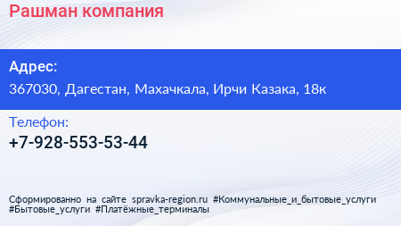 Рашман, компания по адресу 367030, Дагестан, Махачкала, Ирчи Казака, 18к в дальнейшем Организация, размещена в следующих категориях: