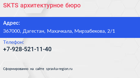 SKTS, архитектурное бюро по адресу 367000, Дагестан, Махачкала, Мирзабекова, 2/1 в дальнейшем Организация, размещена в следующих категориях: