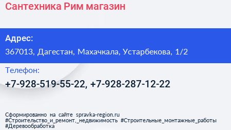 Сантехника Рим, магазин по адресу 367013, Дагестан, Махачкала, Устарбекова, 1/2 в дальнейшем Организация, размещена в следующих категориях: