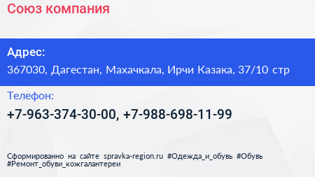 Союз, компания по адресу 367030, Дагестан, Махачкала, Ирчи Казака, 37/10 стр в дальнейшем Организация, размещена в следующих категориях: