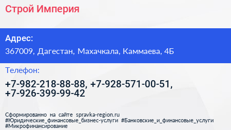 Строй-Империя по адресу 367009, Дагестан, Махачкала, Каммаева, 4Б в дальнейшем Организация, размещена в следующих категориях: