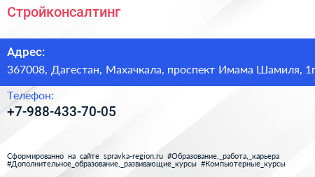 Стройконсалтинг по адресу 367008, Дагестан, Махачкала, проспект Имама Шамиля, 1г в дальнейшем Организация, размещена в следующих категориях: