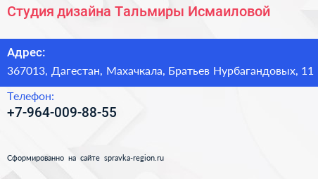 Студия дизайна Тальмиры Исмаиловой по адресу 367013, Дагестан, Махачкала, Братьев Нурбагандовых, 11 в дальнейшем Организация, размещена в следующих категориях: