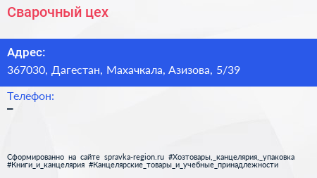 Сварочный цех по адресу 367030, Дагестан, Махачкала, Азизова, 5/39 в дальнейшем Организация, размещена в следующих категориях: