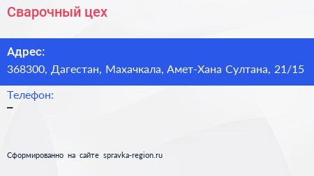 Сварочный цех по адресу 368300, Дагестан, Махачкала, Амет-Хана Султана, 21/15 в дальнейшем Организация, размещена в следующих категориях: