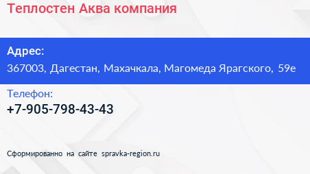 Теплостен-Аква, компания по адресу 367003, Дагестан, Махачкала, Магомеда Ярагского, 59е в дальнейшем Организация, размещена в следующих категориях: