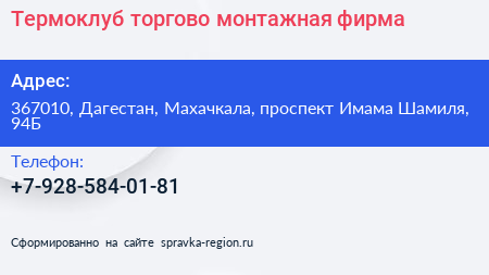 Термоклуб, торгово-монтажная фирма по адресу 367010, Дагестан, Махачкала, проспект Имама Шамиля, 94Б в дальнейшем Организация, размещена в следующих категориях: