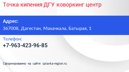 Точка кипения ДГУ, коворкинг-центр по адресу 367008, Дагестан, Махачкала, Батырая, 1 в дальнейшем Организация, размещена в следующих категориях: