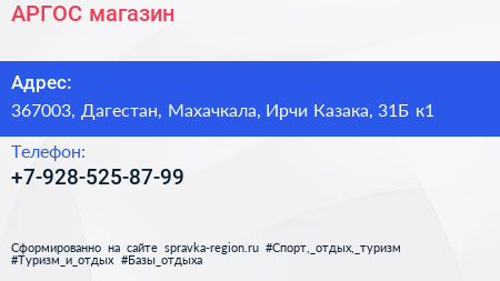 АРГОС, магазин по адресу 367003, Дагестан, Махачкала, Ирчи Казака, 31Б к1 в дальнейшем Организация, размещена в следующих категориях: