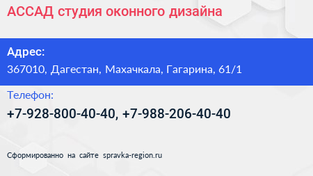 АССАД, студия оконного дизайна по адресу 367010, Дагестан, Махачкала, Гагарина, 61/1 в дальнейшем Организация, размещена в следующих категориях: