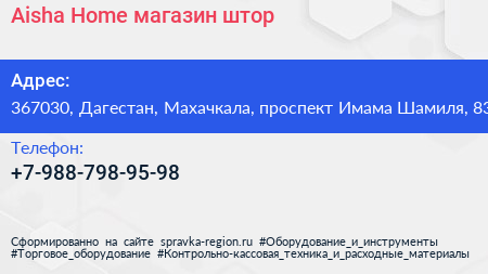 Aisha Home, магазин штор по адресу 367030, Дагестан, Махачкала, проспект Имама Шамиля, 83 в дальнейшем Организация, размещена в следующих категориях: