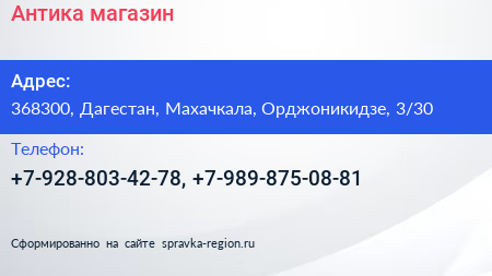 Антика, магазин по адресу 368300, Дагестан, Махачкала, Орджоникидзе, 3/30 в дальнейшем Организация, размещена в следующих категориях: