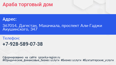 Араба, торговый дом по адресу 367014, Дагестан, Махачкала, проспект Али-Гаджи Акушинского, 347 в дальнейшем Организация, размещена в следующих категориях: