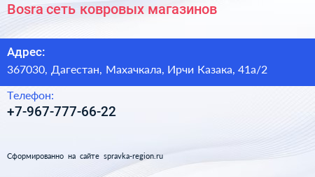 Bosra, сеть ковровых магазинов по адресу 367030, Дагестан, Махачкала, Ирчи Казака, 41а/2 в дальнейшем Организация, размещена в следующих категориях: