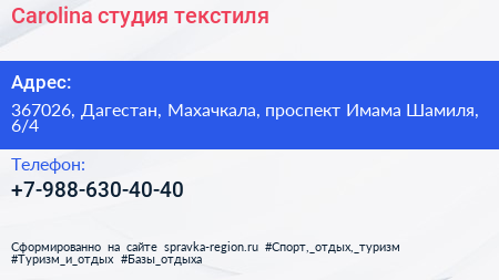 Carolina, студия текстиля по адресу 367026, Дагестан, Махачкала, проспект Имама Шамиля, 6/4 в дальнейшем Организация, размещена в следующих категориях:
