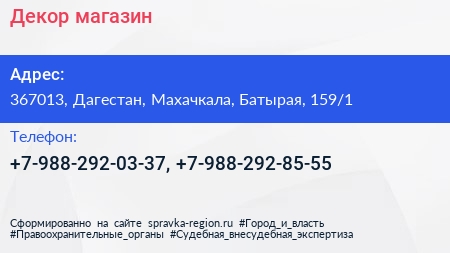 Декор, магазин по адресу 367013, Дагестан, Махачкала, Батырая, 159/1 в дальнейшем Организация, размещена в следующих категориях: