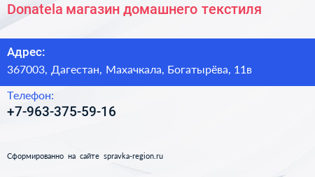 Donatela, магазин домашнего текстиля по адресу 367003, Дагестан, Махачкала, Богатырёва, 11в в дальнейшем Организация, размещена в следующих категориях: